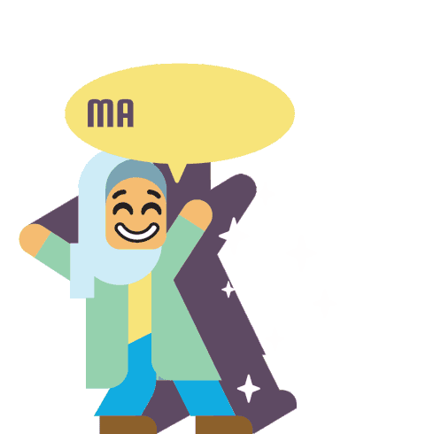 A happy Muslim character from 5pillarsgame, wearing a hijab, joyfully exclaims "MASHALLAH!" amidst sparkling stars.