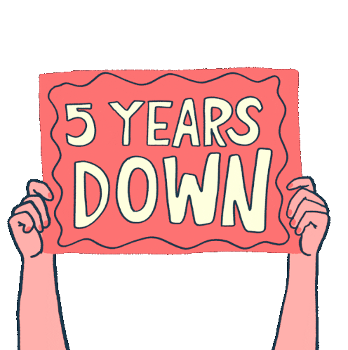 Animated sticker showing protest signs: '5 Years Down', 'Forever To Go', and 'We Won't Stop', symbolizing ongoing activism and the 5-year anniversary of fighting for rights.