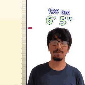 a man with glasses stands in front of a ruler that reads 196 cm 6 ' 5 '
