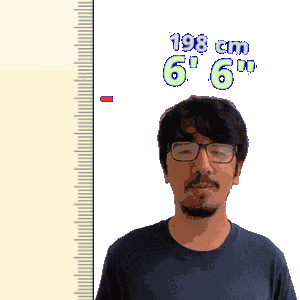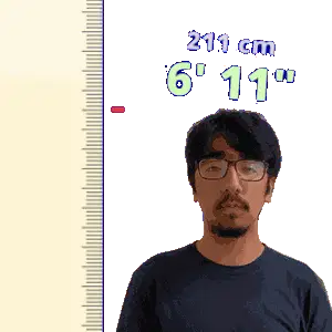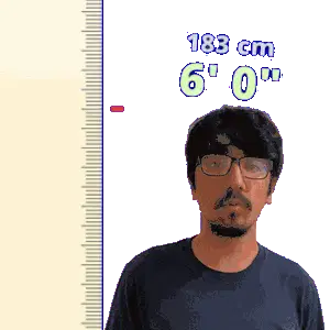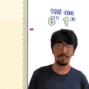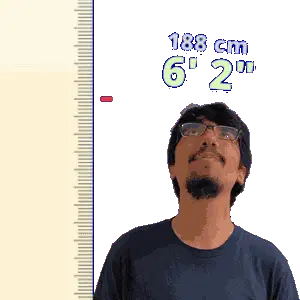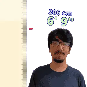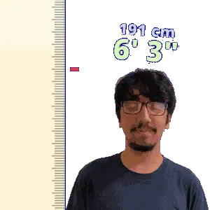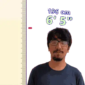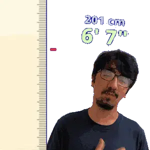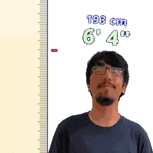 a man wearing glasses is standing in front of a ruler that says 198 cm 6 ' 6 "