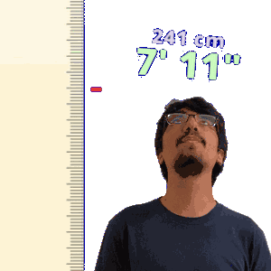 a man is measuring his height with a ruler that says 241 cm 7'11 "