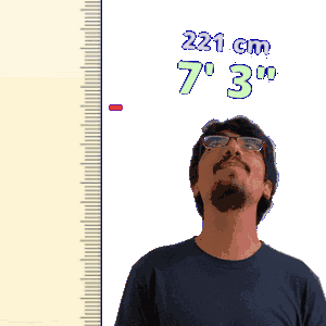 a man wearing glasses is standing in front of a ruler that says 221 cm