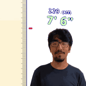 a man wearing glasses is standing next to a ruler that says 229 cm 7 ' 6 "