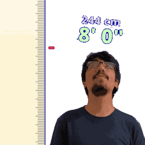 a man with glasses stands in front of a ruler that says 244 cm 8 0