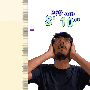 a man covering his ears in front of a ruler that reads 269 cm 8 ' 10 '