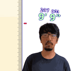 a pixelated image of a man standing next to a ruler that says 297 cm 9 ' 9 "
