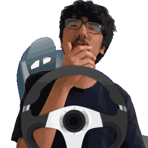 a man with glasses is holding a steering wheel in his hand