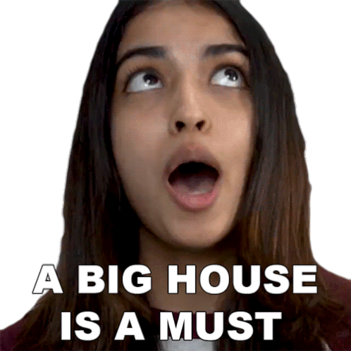 A young woman emphatically states "A BIG HOUSE IS A MUST" with wide eyes, expressing a strong desire for a large home.