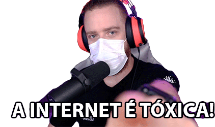 Lucas Feurschutte, wearing a mask and headset, declares 'A Internet É Tóxica!' (The Internet Is Toxic!) into a microphone.