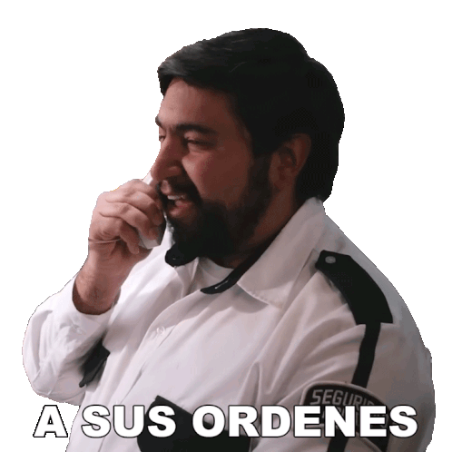 Daniel García, a security guard, answers a phone call, saying "A Sus Ordenes" (At your service).