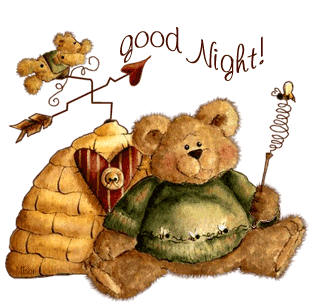 A charming teddy bear in a green sweater sits by a beehive, with "good Night!" text and a flying bear.