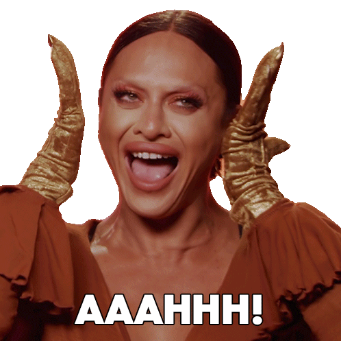 Sasha Colby dramatically screams "AAAHHH!" with hands raised, a classic reaction from RuPaul's Drag Race.