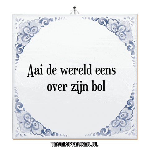 a blue and white tile with the words aai de wereld eens over zijn bol on it