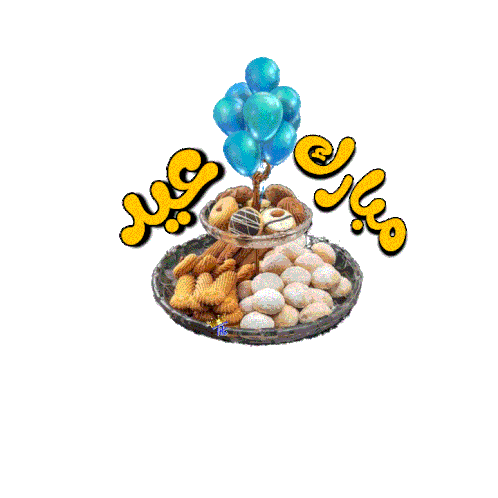 Vibrant Eid Mubarak sticker featuring a tray of traditional sweets and festive blue balloons, perfect for holiday greetings.