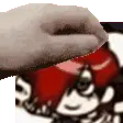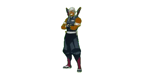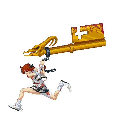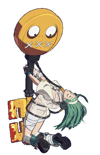 Aba from Guilty Gear Strive hangs upside down, holding onto her large, yellow Morgenstern weapon with a stitched mouth.