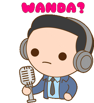 Jimmy Woo from WandaVision, wearing headphones and holding a microphone, asking 'WANDA?'. A fun reface sticker.