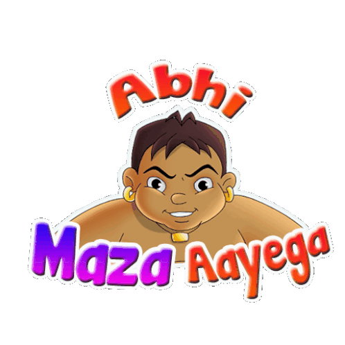 Kalia from Chhota Bheem smiles mischievously with the Hindi phrase 'Abhi Maza Aayega' (Now the fun will begin), perfect for playful anticipation.