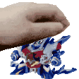A hand gently pats the head of a small toy robot, possibly named Able Pat, on a light background.