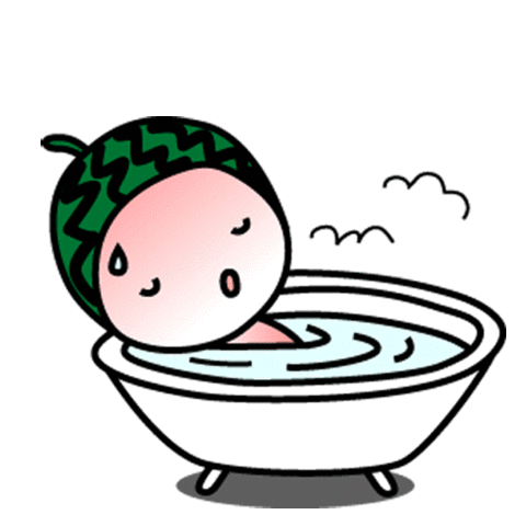 A cute watermelon-hatted character is enjoying a hot bath, sweating from the warmth and steam.