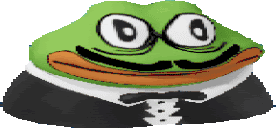 A pixelated green frog character, resembling Pepe, with a mustache and glasses, wearing a suit, blinks and smiles.