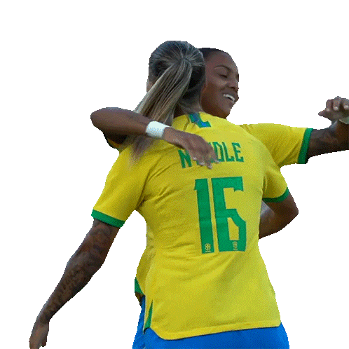 Duas jogadoras da seleção brasileira de futebol feminino se abraçam em um momento de celebração ou apoio.
