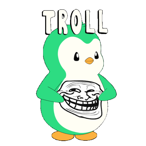 Abster the green penguin reveals a classic Trollface meme, playfully hiding and showing his face with the word 'TROLL' appearing above.