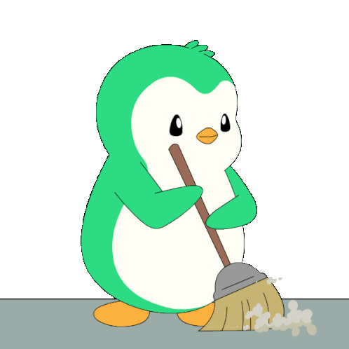Abster, the abstract green and white penguin, diligently sweeps the floor with a broom held in its beak.