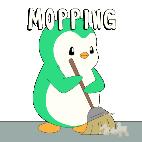 An animated green and white penguin character diligently mops the floor, performing household chores.