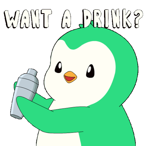 Abster, the green penguin, holds a cocktail shaker and asks 'Want a Drink?'. Perfect for inviting friends to a bar or hangout.