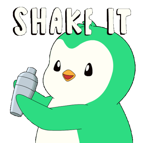 A cheerful Abster Abstract penguin holds a cocktail shaker, with the words 'SHAKE IT' above, ready to mix drinks and party.