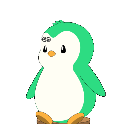 a green and white penguin with the number 69 on it 's head