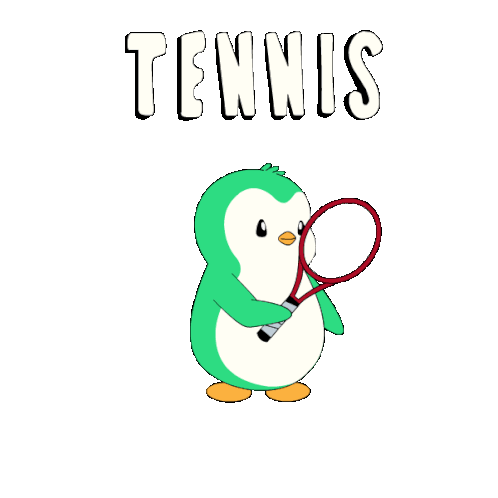 A cute, pudgy penguin character, possibly from Abster Abstract, holds a tennis racket, with a tennis ball appearing. The penguin changes color from green to blue.