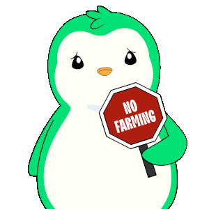 A cute Pudgy Penguin holds a red 'NO FARMING' stop sign, then a green abstract chain symbol with a happy expression.