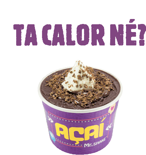 An animated açaí bowl from Mr. Shake with changing toppings, accompanied by the Portuguese text "TA CALOR NÉ?" (It's hot, isn't it?).