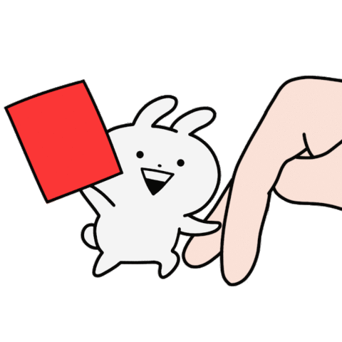 A cute white cartoon rabbit happily holds a red card while a human finger points, possibly guiding or warning.