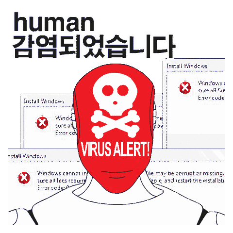 A robot's head displays a 'VIRUS ALERT!' mask, surrounded by multiple computer error pop-ups and Korean text indicating infection.