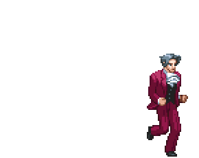 Ace Attorney character Miles Edgeworth in pixel art style, running with determination. A dynamic sticker for fans.