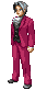 A pixel art character from Ace Attorney, a man in a pink suit, points forward with determination.