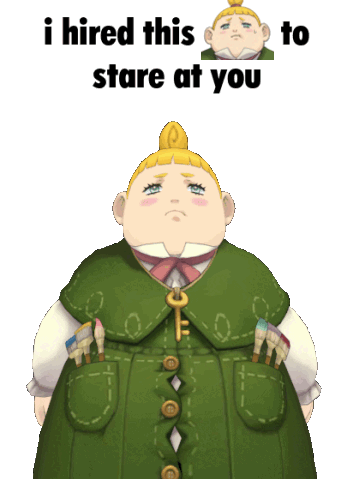 A character from Ace Attorney: The Great Ace Attorney stares with an unimpressed look, captioned 'i hired this to stare at you'.