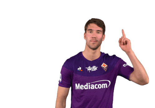 Dusan Vlahovic, wearing a purple Fiorentina jersey, covers his ears in a goal celebration gesture.