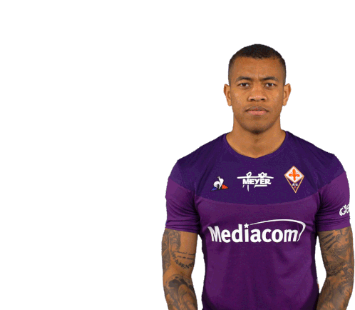 A Fiorentina player in a purple jersey makes a praying gesture with hands clasped together, showing tattoos on his arms.