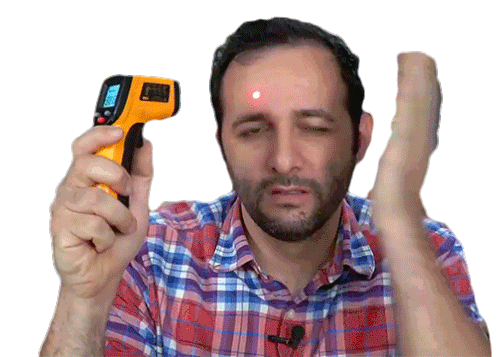 Ibere Thenorio looks distressed, holding an infrared thermometer to his forehead, indicating illness or a high temperature.
