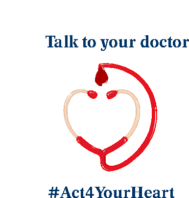 An animated sticker for Act4yourheart Diabetes Awareness, featuring a stethoscope forming a heart with a blood drop, encouraging talking to your doctor.