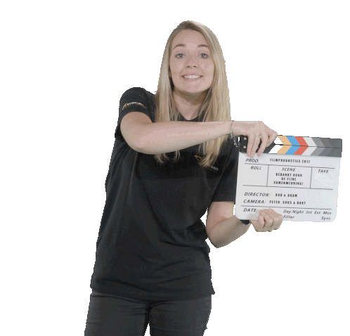 Video Mattie claps a film clapboard, exclaiming 'Action!' with a smile, ready to start filming.