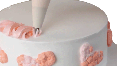 A close-up view of a white cake being decorated with delicate pink icing swirls and heart shapes using a piping bag.