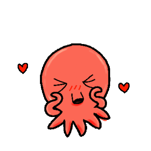 A shy, cute red octopus blushes happily with hearts floating around, expressing love and admiration.