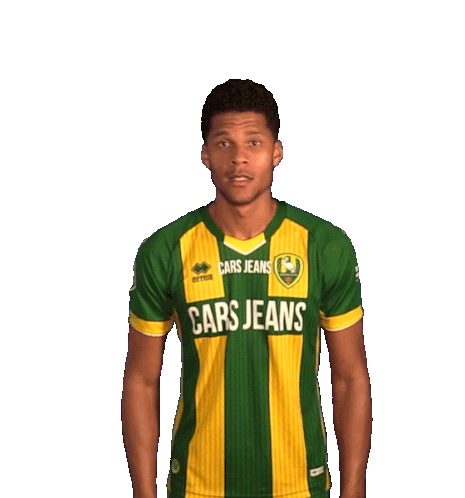 Jordan Spence, wearing his Ado Den Haag jersey, celebrates by raising his arms and pointing upwards.