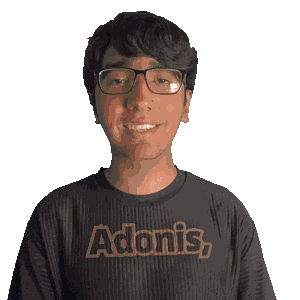 a man wearing glasses and a black shirt that says adonis on it