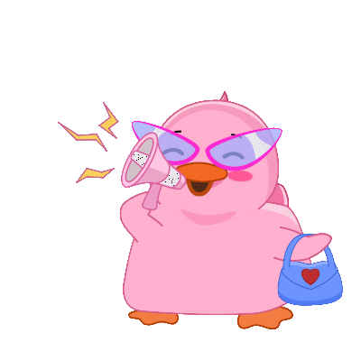 An adorable pink duck character wearing stylish purple sunglasses and holding a pink megaphone, ready to speak.