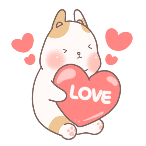 An adorable cartoon cat-like creature holds a large pink heart with 'LOVE' written on it, surrounded by shimmering smaller hearts, expressing affection.